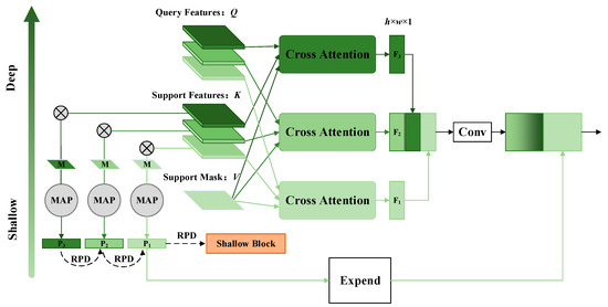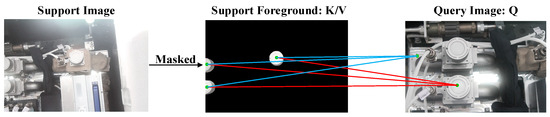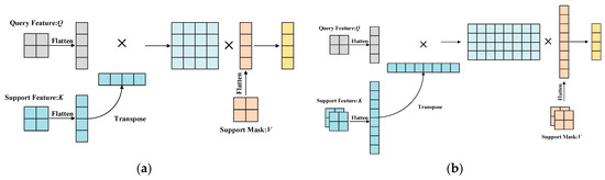 One of the critical techniques in FSS is to find the association between the support feature and the query feature. Cross-attention is an effective pixel-wise association method that has been widely used in many studies [12,13,43,44]. The key to cross-attention is that in Equation (1) come from different feature maps. Methods in [12,13] use query features as Q and background-removed support features as K and V, while the support mask is used for background removal only. Such an approach is suitable for natural datasets such as COCO [14] and PASCAL VOC [50], which obtain images with significant inter-class differences and large foreground–background differences. Thus, removing the background before transformers indeed reduces the effect of irrelevant factors.