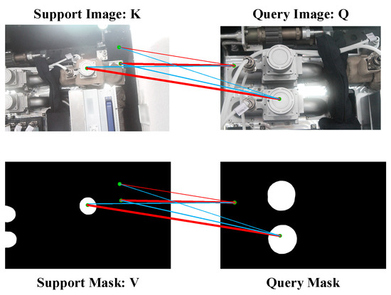 Inspired by DCAMA [44], we adopt another form of cross-attention. As shown in Figure 3, Q, K, and V are query features, support features, and support masks, respectively. We first compute the affinity matrix, , followed by softmax, i.e., , which represents the pixel-wise dense correlation in K and Q. Unlike [12,13], the BG of the support features is also involved in the computation. Therefore, combines the different feature values of FG and BG and their corresponding positional encodings to contain more information. A higher similarity between the support and query features leads to a stronger correlation. The thickness of the lines is used in Figure 3 to indicate the degree of correlation. A weaker correlation between dissimilar features helps to distinguish features that are semantically different but similar in appearance. In addition, we multiply with V, i.e., . The learned correlation is used to weight the support mask to obtain query masks.