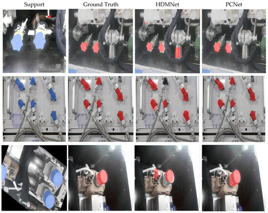 Figure 7 shows a visual comparison between HDMNet and PCNet under the 1-shot setting. Although HDMNet is a SOTA method on natural datasets, it does not work well on AWS images, providing few correct and complete segmentations. In contrast, PCNet works much better because of its unique specifications for AWS data. Figure 8 shows the visualization of PCNet under 1-shot and 5-shot settings. Similar to most FSS methods, the segmentation becomes better as support cues increase in amount.