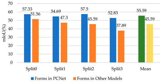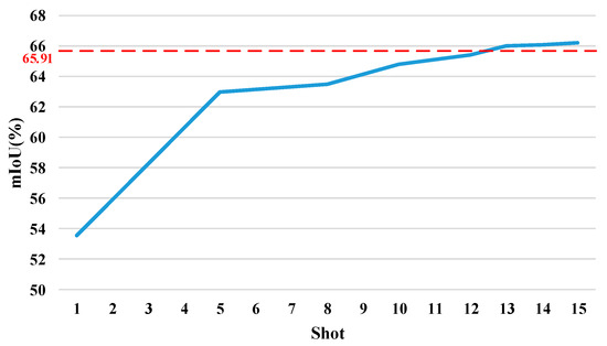 Figure 10 shows the average accuracy across all four splits with different amounts of support data. The red dotted line is the result of PSPNet. For FSS, the mIoU has increased significantly from the 1-shot to the 5-shot setting, increasing by 17.61%. However, the curve from the 5-shot to the 15-shot setting is relatively flat, with a growth rate of 5.14%. In particular, when the number of support features is greater than 10, the improvement in accuracy is slower. From the 10-shot to 15-shot setting, the accuracy increases by only 2.21%. While PCNet’s accuracy surpasses PSPNet after the 13-shot setting, the increment is small. The 15-shot setting is only 0.47% more accurate than PSPNet. After the 15-shot setting, it does not make much sense for FSS, so it can be assumed that the PCNet’s accuracy is stable at the same level as PSPNet.