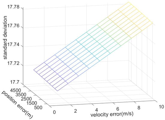 Based on Equation (17), we obtain the normalization result of the standard deviation, as shown in Figure 3. From Figure 3, it can be observed that when the initial velocity error in the direction and the initial position error in the direction change, the corresponding adjustment coefficients are determined through the least squares method and then substituted into the equation. Considering the nature of straight lines, after normalization, the standard deviation of the orbit propagation error over the entire observation period is generally around 17, proving the position error and velocity error can be fitted into a new observation direction using the adjustment coefficient k.