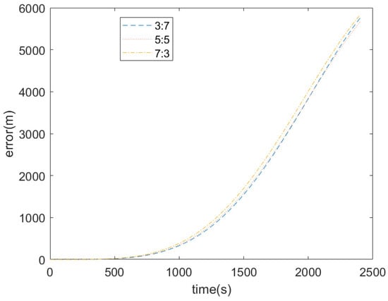 In this subsection, we delve into the influence of different sampling ratios of position and velocity on the outcomes under the conditions of a constant magnitude and an invariant reactive motion state measure. According to Equation (19), when using reactive-motion-state-measure-combined error sampling, it is necessary to set the position error proportional coefficient and the velocity error proportional coefficient . Figure 5 illustrates the orbital extrapolation error curves resulting from different ratios under a constant reactive motion state measure. The figure reveals that the three orbital extrapolation error curves are very close to each other, indicating that under the premise of an unchanged reactive motion state measure magnitude, the error from different position and velocity ratios has a minimal impact on the orbital extrapolation error. Table 3 shows that the value error is around 0.0001, and the error of the reactive motion state measure is also within the error range, with the minimum error when the ratio of and is 5 to 5.
