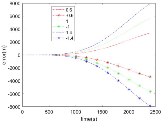Using the previously mentioned ratio of 5 to 5 for the reactive motion state measure, denoted as and as a baseline, denoted as , Figure 5 shows the trajectory recursion error curve caused by changing the size of the sensitive motion state measure (as shown in Table 4, which is compared to the size of ) when the sampling ratio of position and velocity remains unchanged. From Figure 6, it is evident that the values of the reactive motion state measure are influenced by positive and negative factors. However, it is not possible to distinguish between positive and negative solely based on the calculated values, as the resulting orbit propagation error curves exhibit an almost symmetrical relationship. Nevertheless, according to Table 4, the difference in search errors for reactive motion state measures of opposite magnitudes is minimal. In contrast, under different proportions, the three orbit propagation error curves show more noticeable differences, indicating that the magnitude of the reactive motion state measure has a significant impact on the orbit propagation error.