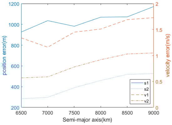 In this section, we explore the impact of the semi-major axis on the accuracy of the comprehensive measurement method for position and velocity. Figure 8 shows the performance of the comprehensive measurement of position and velocity for different semi-major axes. As can be seen from Figure 8, as the semi-major axis gradually increases, curves s1 and v1, which represent the search accuracy of the dimensionless directional search for position and velocity, have larger errors and cannot be used for navigation; the errors for velocity measurement (curve v2) and range measurement (curve s2) in the comprehensive measurement show an increasing trend. This is because the position error and the velocity error lead to a decrease in the positional error along the line of sight of the pulsar, thereby causing a very small cumulative profile distortion of the pulsar. That is, the sensitivity of the pulsar’s cumulative profile distortion to the position error and velocity error is low, leading to an increase in the comprehensive measurement error. However, overall, the accuracy of the comprehensive measurement is good. With a semi-major axis of 9000 km, the velocity error is maintained below 1.2 m/s, and the position error is maintained below 550 m.