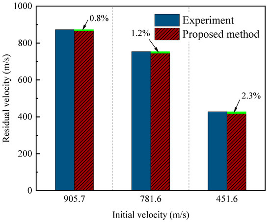Table 3 and Figure 3 show the projectile residual velocity after the high-speed impact. Under the same incidence angle and thickness, the residual velocities of the projectiles with different initial velocities predicted by the proposed method are in good agreement with the experimental measurements, and the maximum error is 2.3%. It shows that the proposed method for helicopter fuselage projectile wounds can accurately predict the residual velocity of the projectile at different initial velocities.