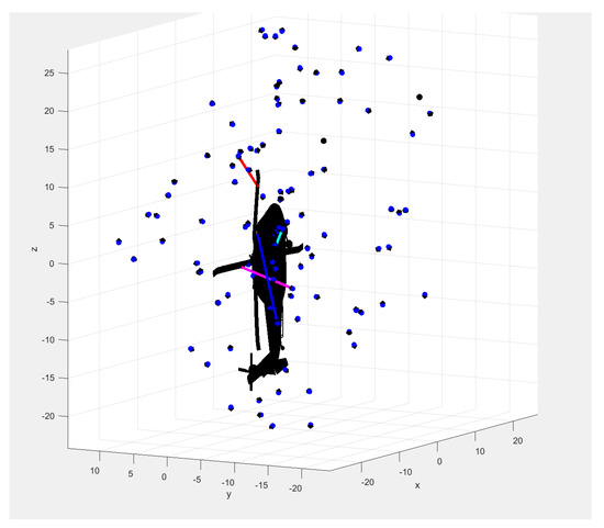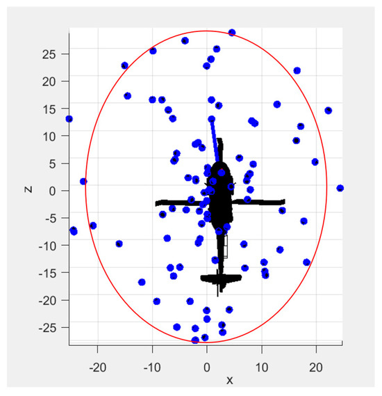 First, the simulation of a specific type of helicopter projectile damage, the projectile body diameter of 12.7 mm, the projectile length of 75 mm, and the projectile speed of 1000 m/s. The normrnd function randomly generates 50 space projectile points around the helicopter model according to the normal distribution of anti-aircraft projectile points. Figure 4 shows the normal distribution of projectiles in the 3D space around the helicopter. Red circle indicates normal distribution ranges, and blue dots indicate randomly projectile points. Figure 5 shows the visualization of the strike simulation in the numerical program.