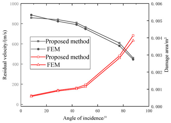 The medium damage area is the maximum envelope area of the damaged and destroyed unit after the fuselage surface is hit by the projectile. Table 5 shows the residual velocity and damage area at different incidence angles calculated by the proposed method.