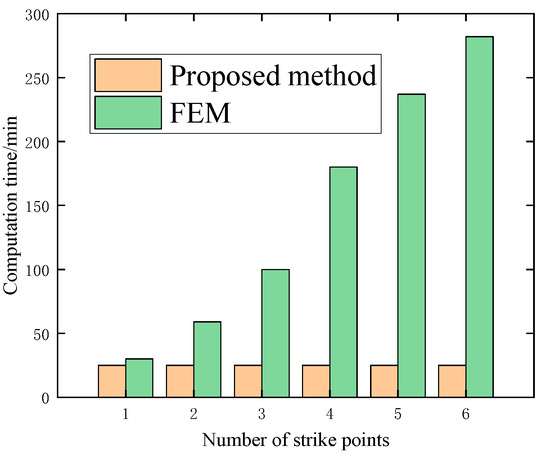 In addition, the proposed method can realize the damage analysis of multi-projectile strikes simultaneously, and the calculation time is the same with an increase in the number of strikes as shown in Figure 9. In contrast, the computational time of FEM shows a linear increase with an increased number of strikes. In the case of six different strikes, the time consumed by the proposed method is reduced by 92.1% compared with the FEM. Therefore, the proposed established method is more efficient than the FEM.