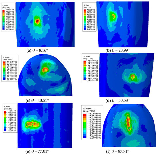 Figure 10 shows the stress nephogram for six impact points. The maximum stresses at the incidence angles of 8.16°, 28.99°, 43.51°, 50.53°, 77.01°, and 87.71° for the six strike points are 462.2, 527.5, 487.4, 547.6, 503.1 Mpa, and 506.4 MPa, respectively. In addition, the damage area increases with an increase in the incidence angle. When the incidence angle reaches 77.01°, the angle between the projectile body and the fuselage surface decreases slightly, leading to ricochet. The projectile body slips and rubs on the fuselage surface, producing a larger damage area. Therefore, when the angle of incidence at the point of impact is large, the slip–friction damage produced by the projectile will cause the structural strength of the fuselage surface to be reduced more, and the degree of danger is high.