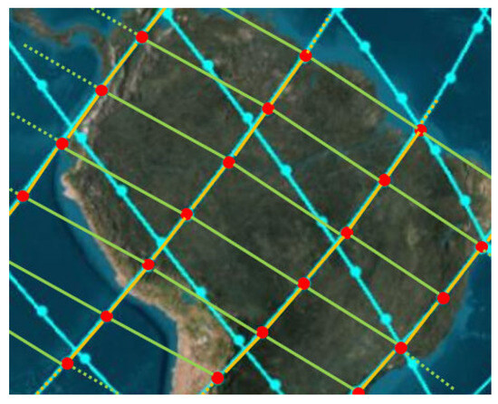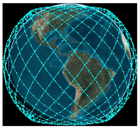 25]. Next, this study validates the superior performance of the satellite-to-satellite topology structure established by the proposed algorithm in terms of its configuration compared to the traditional Manhattan configuration. Taking the communication delay between Los Angeles, United States, and Xiamen, China, as an example, only the propagation delay (not the transmission delay) is considered, and the Dijkstra algorithm is used to calculate the shortest path. Due to space limitations, this paper does not present the specific implementation of the Dijkstra algorithm, but directly presents the propagation delay results based on this algorithm for the Los Angeles–Xiamen route.