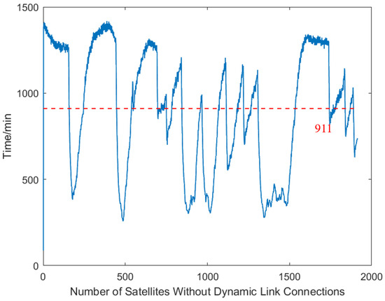Figure 9. Throughout a satellite’s orbit period, a substantial number of satellites remain unconnected at any given moment. With a total constellation size of 1584 satellites, the simulation results reveal that the number of satellites in unconnected dynamic links determined by the greedy algorithm ranges from a maximum of 1416 to a minimum of 88, indicating an excessive number of satellites remaining unconnected.