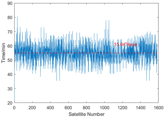 Figure 10 demonstrates that the average total unconnected time for satellites calculated using the greedy algorithm is 55.05 min. It should be noted that the orbital period for each satellite is merely approximately 95 min.