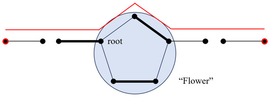 This ring is interconnected with other nodes, referred to as “petals,” thus creating a distinctive graphical structure. Every point on the odd cycle that possesses an outgoing unmatched edge has the potential to serve as an edge in an augmenting path, where reversing the state of edges within a flower according to the definition of an augmenting path would disrupt the matching pattern inside of the flower. However, as evident from