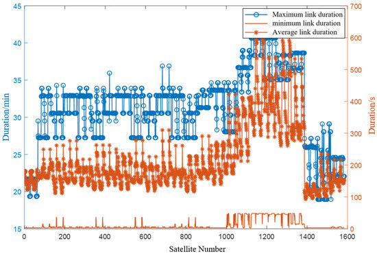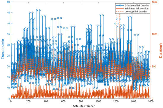 Figure 7, the greedy algorithm is applied to optimize the link durations for each satellite within an orbital cycle. The blue curve illustrates the maximum link duration. Following computation, the greedy algorithm yields an average maximum link duration of 450.74 s (approximately 7.51 min), with an average link duration of 23.96 s. However, the average minimum link duration is merely 3.0852 s, posing potential challenges in establishing stable connections.