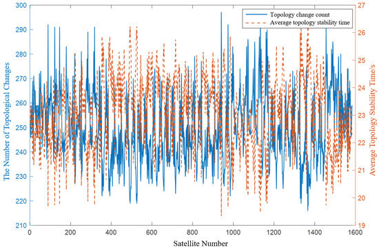 The average number of topological transformations per satellite is approximately 132, and the average stable time for each satellite can be determined using Equation (8), as follows: