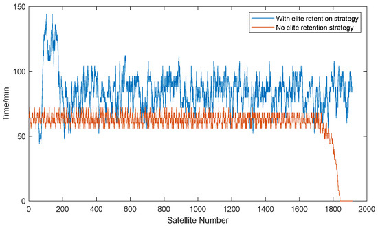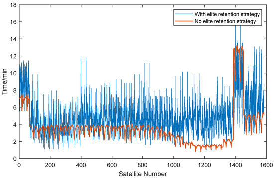 In contrast, the red line represents the algorithm augmented with the elite retention strategy. The red line demonstrates that this algorithm maintains a consistently lower and relatively stable number of satellites without dynamic links throughout most time intervals. This indicates that the elite retention strategy effectively reduces satellite disconnections and significantly enhances the resource allocation efficiency and stability. Regardless of high- or low-resource-demand periods, the red line consistently exhibits superior performance, showing that this strategy is more flexible and effective in handling varying conditions. The vertical comparison focuses on the overall performance of the algorithms throughout an entire orbital period. By calculating the total time each satellite is without dynamic links during the orbital period, we can evaluate the long-term efficiency of the algorithms.