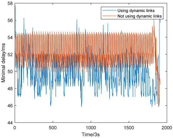 Before calculating the communication delay, it is essential to determine the satellite connections directly above the coordinates of both cities at each moment. In this study, the proximity principle is adopted, assuming that, at each moment, both Xiamen and Los Angeles establish connections with the nearest satellite directly above them. The dynamic links obtained using the general graph maximum weight-matching algorithm proposed in this research, which incorporates an elite retention strategy, serve as the configuration for the “3 + 1” topology scheme. This configuration is then compared to the traditional Manhattan configuration, which does not utilize dynamic links. The simulation results are shown in the figure below.