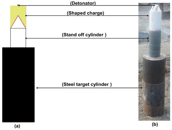 Shaped charge jet attack logistical safety assessment configuration for JH-2 with 50 mm protection and 10 mm container wall: (a) schematic diagram; (b) real image.