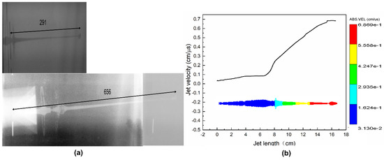 The flash X-ray investigation unveiled a velocity of 6.87 km/s and a diameter of 2.5 mm for the shaped charges. These findings were further validated by numerical simulations. Additionally, it was observed that the velocity exhibited a linear change along the jet’s length, as shown in Figure 7. To ensure accurate measurement of v2d values, it is recommended to measure the velocity, behind the jet tip anomalies, and the diameter of the jet.