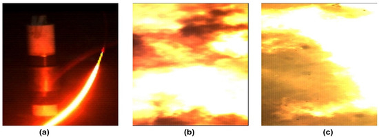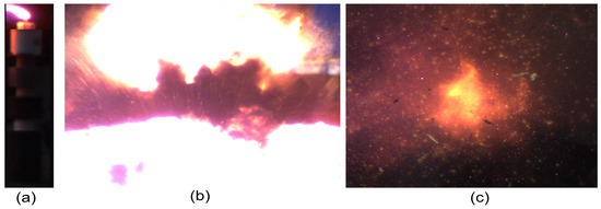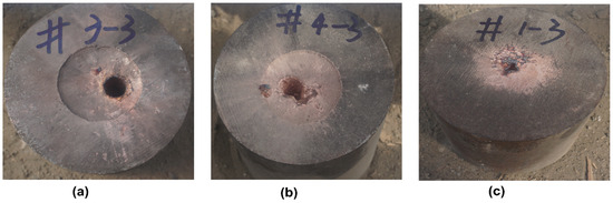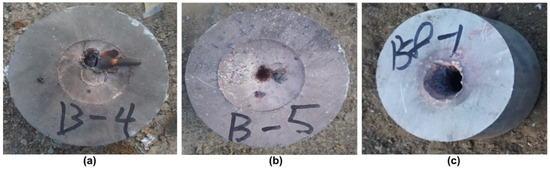 The steel walls of the containers in the logistical configurations and storage boxes, both of thin steel construction, were readily breached by shaped charge jets when the wall thickness was 10 mm and even when the overall wall thickness was increased to 50 mm with the addition of steel. These jets subsequently impacted the energetic material targets, leading to their detonation. This detonation event was evident in the observed crater on the steel witness cylinder compared to baseline experiments illustrating jet penetration, as shown in Figure 11a,b, with Figure 11c depicting the typical jet penetration pattern in a steel cylinder. The detonation process of the energetic materials is delineated in Figure 12a,b, while the burning of energetic materials in the case of steel protection greater than 60 mm, especially in the case of TNT, was clearly discernible by the burn marks on the witness cylinder, as depicted in Figure 12c.