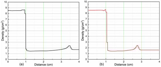 (a) Density profile of JH-2 and (b) density profile of TNT. Density profiles can give evidence of the ignition of a material according to the ignition and growth model; ignition only starts if the density compression is greater than the critical compression threshold of the respective materials.