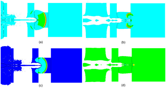 In the case of Figure 13a and Figure 13b, the related pressure contours show the detonation of both JH-2 and TNT explosives, manifested as shock waves, as illustrated in Figure 14a and Figure 14c. Standard International Organization for Standardization (ISO) containers used for transporting goods only have a wall thickness of 1.6 to 7 mm, which is insufficient to prevent detonation during a shaped charge jet attack. This was evident in our tests, where both TNT and JH-2 with 10 mm wall thickness containers (Figure 14a,c) underwent detonation. However, when 65 mm of protection was directly attached to the explosives (Table 1 and Figure 14d), neither TNT nor JH-2 detonated, successfully passing the AOP4526 test criterion that requires no full or partial detonation to pass energetic materials safety tests. Interestingly, with only 60 mm of separate protection (not directly attached) and a 20 mm steel cover, TNT only burned due to its inherent insensitivity. JH-2, however, detonated in this scenario (Figure 14b), likely due to a reflected shock wave caused by the witness cylinder.