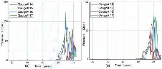 In Figure 16a,b, the pressure profiles corresponding to the specific pressure contour shown in Figure 14d are presented, illustrating configurations incorporating TNT and JH-2 with steel wall protection of 65 mm. It is evident from these representations that despite traversing through the entirety of the energetic materials, the pressure generated remained below the Chapman–Jouguet pressure as the jet traversed through the explosives along its trajectory. Consequently, no detonation occurred in either TNT or JH-2 under these circumstances.