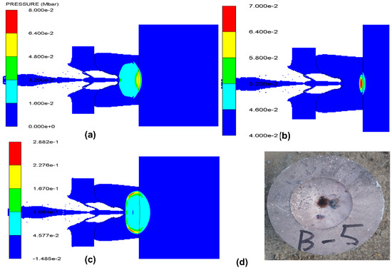 Comparison between numerical and experimental evidence of detonation, where the simulation in (a–c) and experimental results in (d) all indicate that the crater formation could be accurately predicted by the effects of shock waves caused by detonation.