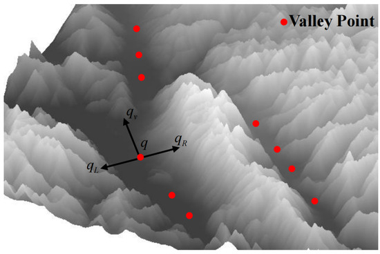 In this section, we conducted valley detection by determining whether there is any obstruction on either side of a specific point q. The core idea is as follows: for a specific point , is the height of q. Assume is the velocity direction of q. Assume and are two points on the left and right sides of point q, perpendicular to the velocity direction of (shown in Figure 5).