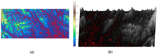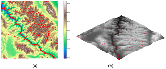 A valley can be defined as the local minimum of the continuous function that represents the topographic profile of the landscape. In mathematical terms, a valley can be expressed as the point on the function where the first derivative is zero and the second derivative is positive, indicating the lowest point in the surrounding area (Figure 4 shows illustrative plot of valley and ridge points). Referring to the literature [6,7], we denote the maximum and minimum principal curvatures as and ( ≥ ) of a specific area of digital elevation maps. We define and as unit vectors of and . We can further define the derivatives of the principal curvatures along their associated directions as