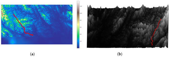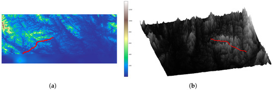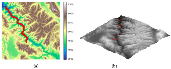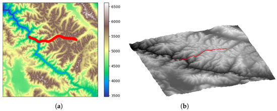 Figure 9a and Figure 10a are the two-dimensional elevation maps of workspace 1, and Figure 9b and Figure 10b are the three-dimensional terrain maps of workspace 1. The red curve represents the planned path. It can be observed that for different start–end point pairs, the algorithm proposed in this paper plans paths that effectively follow the valley lines.