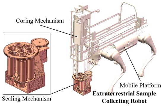 The robotic system can automate the sampling and sealing of extraterrestrial samples. Depending on the specific mission requirements, the number and size of sample tubes carried within the sealing mechanism can be adjusted to accommodate samples collected from different locations and with varying volumes. It consists of a sealing mechanism, a coring mechanism, and a mobile platform, as shown in Figure 1. The terrestrial robots convey the entire system to the designated task location. The coring mechanism drills at specific spots using the coring bit, while the sealing mechanism completes the sealing of the drill samples.