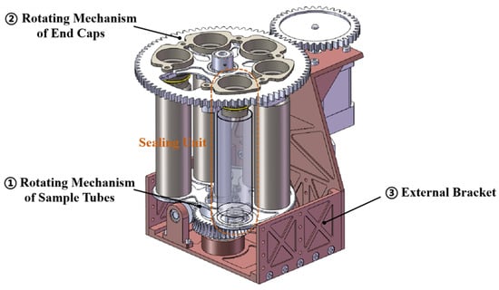 During operation, this mechanism rotates the sample tube into position to receive the sample drilled by the coring mechanism. The rotating mechanism of the sample end cap is employed to rotate the sealing end cap directly above the sample tube in preparation for subsequent sealing. External brackets are utilized to maintain the stability of the entire system.