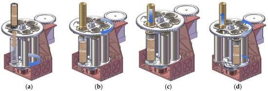 This system is based on the drilling and sampling method and is tightly integrated with the drilling system. The workflow is depicted in Figure 3, divided into four main steps: receiving the extraterrestrial sample, aligning the sealing end cap, executing the sealing, and resetting. During the sealing process, the sample tube is first rotated to the lower part of the drill pipe to receive the sample from the sampling drill pipe. Simultaneously, the seal end-cap storage area is rotated to a specific position so that the seal end cap is aligned directly above the seal canister. At this point, the sampling drill pipe, seal end cap, and seal canister are all axially aligned. The drill rod is lowered, pushing the sealing end cap into the sealing canister within the sealing end-cap storage area. As the process continues, sealing is achieved by an interference fit between the cutter and the seal cartridge. Subsequently, the drill tube rises, and both the seal end-cap storage area and sample tube storage area are reset, ready for the next sampling cycle. The next sampling cycle will take the opposite direction of rotation from the previous cycle, which will cancel out some of the rotation error.