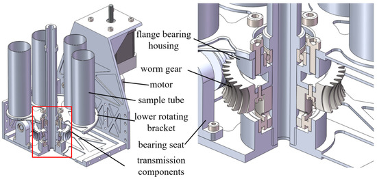 The rotating mechanism of sample tubes is one of the operating components of the proposed autonomous sealing system. This component has two main functions: storing the sample tubes and driving their rotation. To realize the specific operations, the mechanical structure of this component is mainly assembled by: (1) the sample tube bracket and (2) rotary drive system. As shown in Figure 4, the tubes are securely fixed onto the lower rotating bracket in a circular arrangement using screws. The lower rotating bracket is connected to the worm gear via screws through flange bearing housing. Deep groove ball bearings are assembled on the upper end face of the flange bearing housing and the lower end face of the worm gear to ensure synchronization and concentricity during rotation. Additionally, worm gear, bearing, coupling, and other transmission components are assembled on the side of the worm gear through the bearing housing to achieve the precise positioning and rotation of the sample tubes. The number and size of sample tubes can be adjusted according to task requirements.