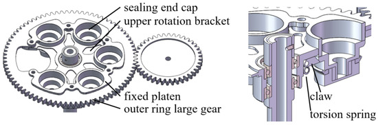 The rotating mechanism of end caps is another operational component of the autonomous sealing system. Similar to the rotating mechanism of sample tubes, the rotating mechanism of end caps is utilized for storing the end caps and driving their rotation. Its overall structure is depicted in Figure 5. The sealing end caps are mounted on the upper rotating bracket in a circumferential distribution, corresponding one-to-one with the sample tubes directly underneath. This arrangement can be adjusted based on factors such as the number and size of sample tubes. In this design, the upper rotating bracket is spaced at intervals of 60° to accommodate the circumferential distribution of five sealing end caps, with shaped drilling holes reserved for interaction with the drilling mechanism. Three torsion spring-driven jaws, spaced 120° apart, secure each sealing end cap, with the upper section anchored by a hollow pressure plate. This installation ensures the stability of the sealing end caps in the non-operational state and prevents interference between components during the sealing process. The upper rotating bracket features a large gear fixed on its outer ring, which is driven by a pinion transmission assembly to enable the precise rotational positioning of the end caps. Bearings are installed at both ends of the upper rotating bracket, nested in the upper end of the center shaft, ensuring synchronization and concentricity of the rotation of the aforementioned components to prevent an eccentric rotation that may affect the seal. A retaining ring is mounted on the top end of the center shaft to ensure the stability of the overall rotating mechanism. The jaws are positioned in corresponding locations on the upper rotation bracket through studs, with the upper end face of the jaws in contact with the lower end face of the upper rotation bracket. Torsion springs are installed in corresponding positions of the upper rotation bracket, just below the jaws, ensuring that the jaws are installed in the same plane.