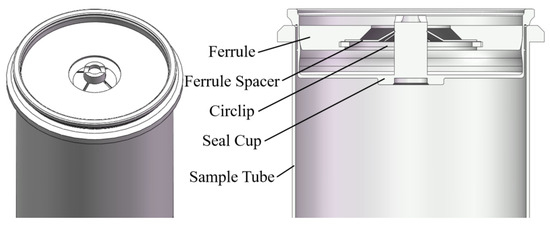 The lateral non-sliding seal structure comprises two main components: the seal cup and the ferrule, as depicted in Figure 6. This sealing mechanism establishes a seal between the outer knife edge of the seal cup and the inner wall of the sample tube through metal extrusion, resulting in plastic deformation. The specific structural details are delineated in Figure 7. During the sealing process, a vertical downward force is applied to the upper face of the ferrule. The ferrule spacer and circlip ensure that the ferrule moves only downward. Inside the sealing cup, there exists a ramp profile opposite the outer knife edge, sized and shaped to allow radial outward contact with the seal cup wall. The ferrule is maintained in the sealing position, providing continuous sealing retention force.