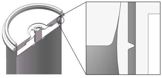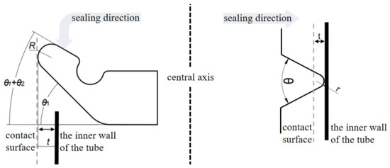 As the symmetrical knife-edge shape, the maximum seal actuation force is 11.4 KN (knife-edge radius = 0.2 mm, and knife-edge angle = 90°), while the minimum seal actuation force is 9.3 KN (knife-edge radius = 0.025 mm, and knife-edge angle = 45°). For the non-symmetrical knife-edge shape, there are two configurations of cross-sectional knife-edge I (Figure 10b) and II (Figure 10c). For non-symmetrical knife-edge shape I, the maximum seal actuation force is 10.4 KN (knife-edge radius = 0.2 mm, and knife-edge angle = 75°), and the minimum seal actuation force is 8.8 KN (knife-edge radius = 0.025 mm, and knife-edge angle = 45°). For non-symmetrical tip shape II, the maximum seal actuation force is 11.9 KN (knife-edge radius = 0.2 mm, and knife-edge angle = 75°), while the minimum seal actuation force is 8.7 KN (knife-edge radius = 0.025 mm, and knife-edge angle = 45°).