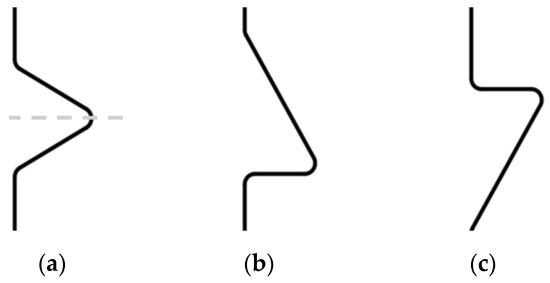 Different shapes of the knife edge: (a) symmetrical cross-sectional knife edge, (b) non-symmetrical cross-sectional knife edge I, and (c) non-symmetrical cross-sectional knife edge II.