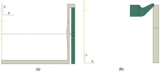 The static general module in ABAQUS is selected to simulate and analyze the sealing process. The specific parameters chosen for the knife edge are listed in Table 1. The overall seal configuration can be achieved by rotating along the central axis. Consequently, in the FEA model, only the seal structure interface is constructed to reduce the computational scale. The constructed axisymmetric FEA model includes the seal cup, the ferrule, and a segment of the sample tube (length 16 mm). The ferrule spacer and circlip, which minimally affect the sealing actuation force, are excluded during model creation. A simplified model for simulating and analyzing the sealing process is depicted in Figure 11a.