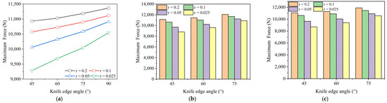 According to the above FEA results, the seal actuation force of the PEEK material is much smaller than other materials; therefore, the seal ring is directly selected as the PEEK material for finite element analysis. The results of the maximum actuation force for each sealing ring are depicted in Figure 17. The FEA analysis is conducted under the same interference fit conditions. The maximum seal actuation force is calculated and compared for seal ring configurations with varying bottom face angles, differences in upper and lower end face angles, and tip radii.