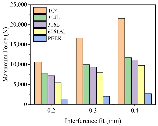 To investigate the effects of structure materials and interference fits on the sealing actuation force, FEAs are conducted and compared for materials including titanium alloy TC4, stainless-steel 304L, stainless-steel 316L, aluminum alloy 6061Al, and PEEK 450G, as illustrated in Figure 15. Interference fits of 0.2, 0.3, and 0.4 mm are applied at the initial assembly states. Based on the numerical results, the required seal actuation force for each structure material increases with a greater interference fit. TC4 demonstrates the highest seal actuation force for each initial interference fit (21.6 KN at 0.4 mm), while PEEK 450G exhibits the lowest seal actuation force. With an interference fit of 0.2 mm, only 1.34 KN of force is needed to achieve seal actuation for PEEK 450G.