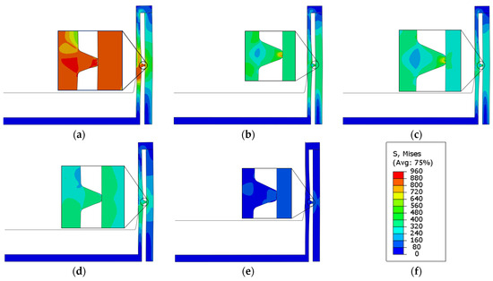 Figure 16 illustrates the stress contours of the sealing retention position for each material, with a symmetrical tip configuration, a knife angle of 45°, a knife angle radius of 0.1 mm, and an interference fit of 0.2 mm.