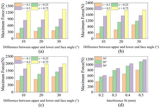Maximum actuation force for each sealing ring calculated by the FEA method: (a) θ1 = 30°, (b) θ1 = 45°, (c) θ1 = 60°, and (d) different interference fits of the seal structure.