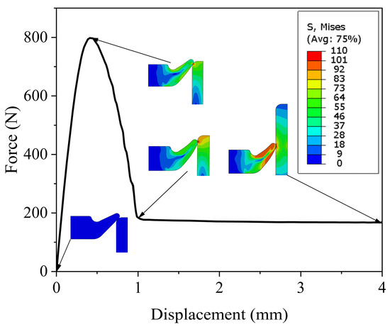 Considering the aforementioned results, and accounting for factors such as machining difficulty, sealing actuation force, and surface contact stress, an interference fit of 0.3 mm, a bottom angle of 45°, an angular difference of 20°, and a tip radius of 0.25 mm have been selected. The maximum sealing force is calculated to be 0.8 KN. This configuration will serve as a reference for subsequent designs. Figure 18 shows a plot of the seal actuation force versus sealing ring downward displacement for selected sealing ring configurations in the FEA model, as well as a plot of the simulated state of the seal ring at a number of specific nodes labeled in the figure.