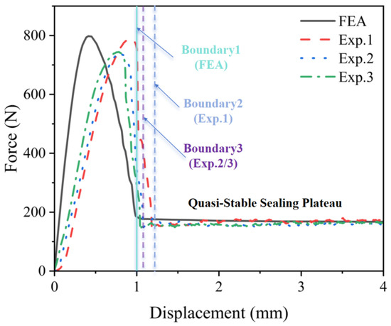 The force increases with displacement at start, until reaching the peak value (maximum actuation force). In this period, the sealing ring undergoes radial compression, which transfers from an elastic deformation state to a plastic one. Then, the force descends with the displacement increasing due to deformation release and redistribution in both the sealing ring and contacted structure. Finally, the sealing structure achieves a steady state with the trivial fluctuation in force varying with displacement. The boundary line noted in the figure is marked as entering into a quasi-sealed state. The boundary lines colored as light green and blue (or purple) represent the FEA and experimental results, respectively.