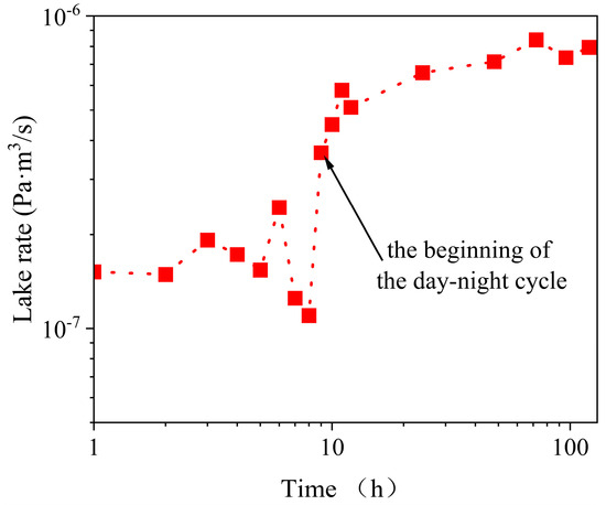 The results indicate that the leakage rate of the sealing mechanism achieves a stable state after 10 h in laboratory-level experiments. The leaking rate can be maintained in the order of 10−7~10−6 Pa·m3/s. The fluctuation in the curve within the first ten hours might been caused by room-temperature variation and measurement errors.