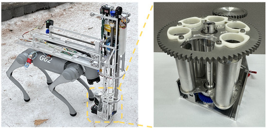 This mechanical system solely serves as a sealing system. To execute the entire set of corresponding tasks, it must be integrated into the extraterrestrial mobile system and the drilling system. The ground mobile system utilizes the Unitree Go2 robot dog to carry the physical assembly of the entire machine system, as depicted in Figure 23. As shown in Figure 24, the workflow of the designed prototype is that the coring bit moves upward and the sample tube rotates to the position below the coring bit. Then, the pushing rod propels the sample from inside the core drill bit into the sample tube. Following this, the core drill bit ascends once more, and the sealing end cap rotates to directly above the sample tube. Finally, the coring bit descends, pressing the sealing end cap into the sealing tube to complete the sealing process.