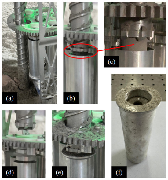 Workflow of automatic sealing mechanism:(a) the coring bit moves upward, (b) the sample tube rotates to the position below the coring bit, (c) the pushing rod propels the sample from inside the coring bit into the sample tube, (d) the core drill bit ascends once more, and the sealing end cap rotates to directly above the sample tube, (e) the coring bit descends, pressing the sealing end cap into the sealing tube, (f) sealed sample tube.