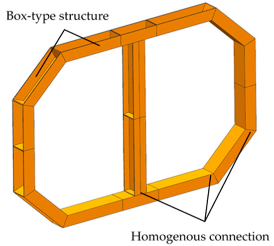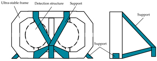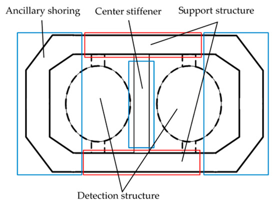 The main function of the core ultra-stable structural framework is to support two sets of detection system structures. To achieve support for the two sets of detection system structures, the ultra-stable structural framework can be divided and designed according to the different functions of each part, providing guidance for subsequent optimization. According to the requirements of gravitational wave detection for the core ultra-stable structural framework, the framework can be divided into supporting structures, central reinforcement beams, and auxiliary frame structures, as shown in Figure 1.